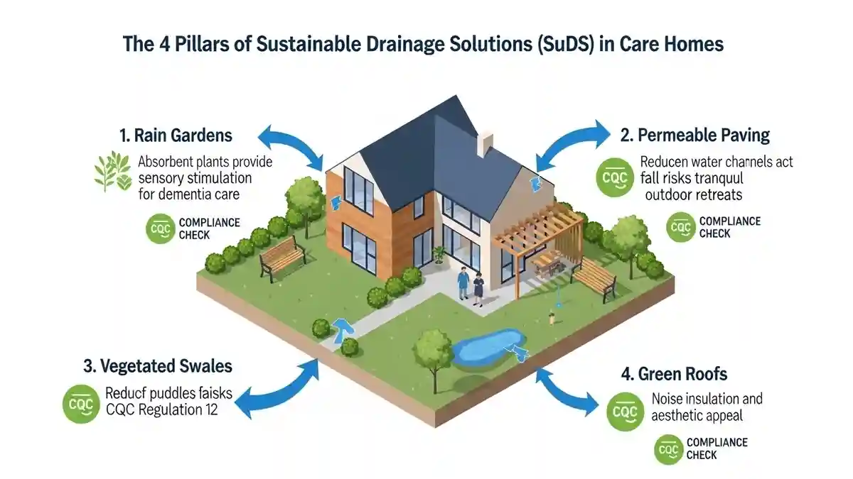 The future of sustainable drainage solutions CQC care home design is the integration of SuDS (Sustainable Drainage Systems). In Witney, Policy EN18 of the Local Plan encourages SuDS to manage surface water runoff, which often plagues the surrounding area.